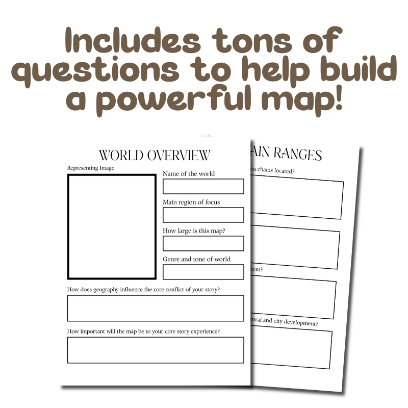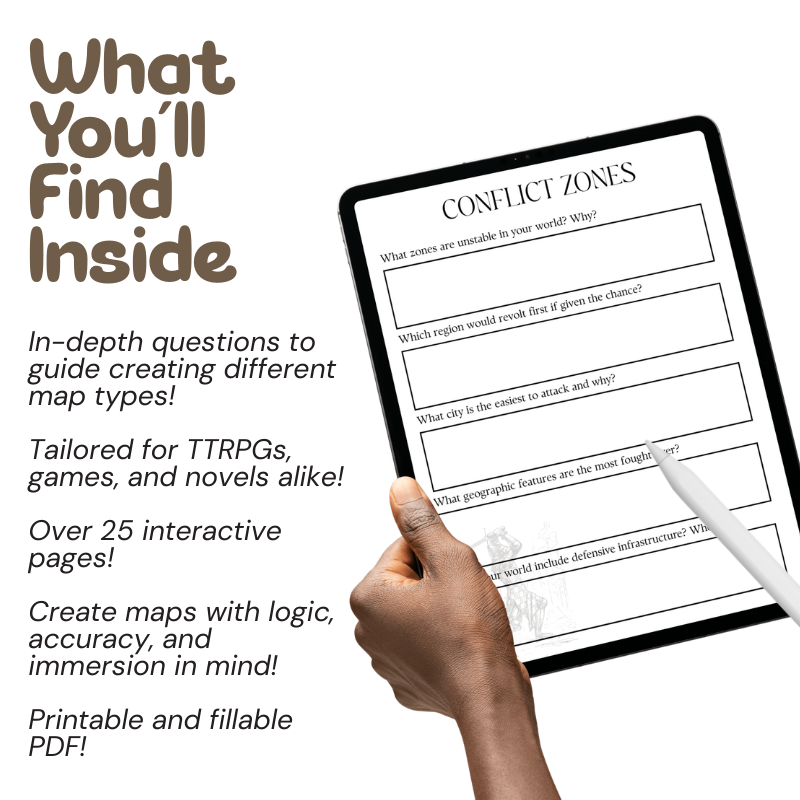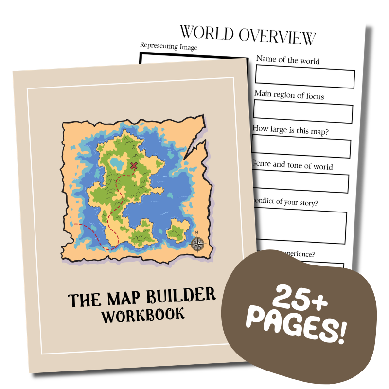 The Map Builder Workbook is a 25+ page fillable and printable planner created for fantasy writers, world builders, and TTRPG creators who want to design maps that actually make sense. Use structured prompts to build mountain ranges, river systems, climate regions, cities, trade routes, and travel distances that shape politics, culture, and conflict in your world.
