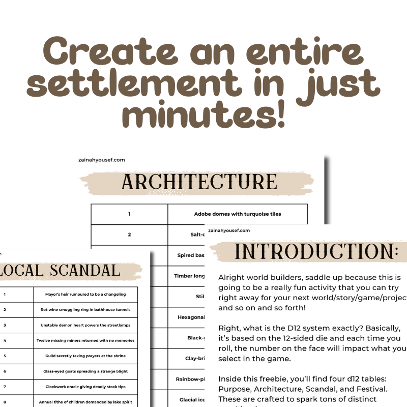 With just a few rolls, you’ll generate a unique settlement brimming with character. No prep, no pressure, and no need to overthink. Just roll, build, and write.