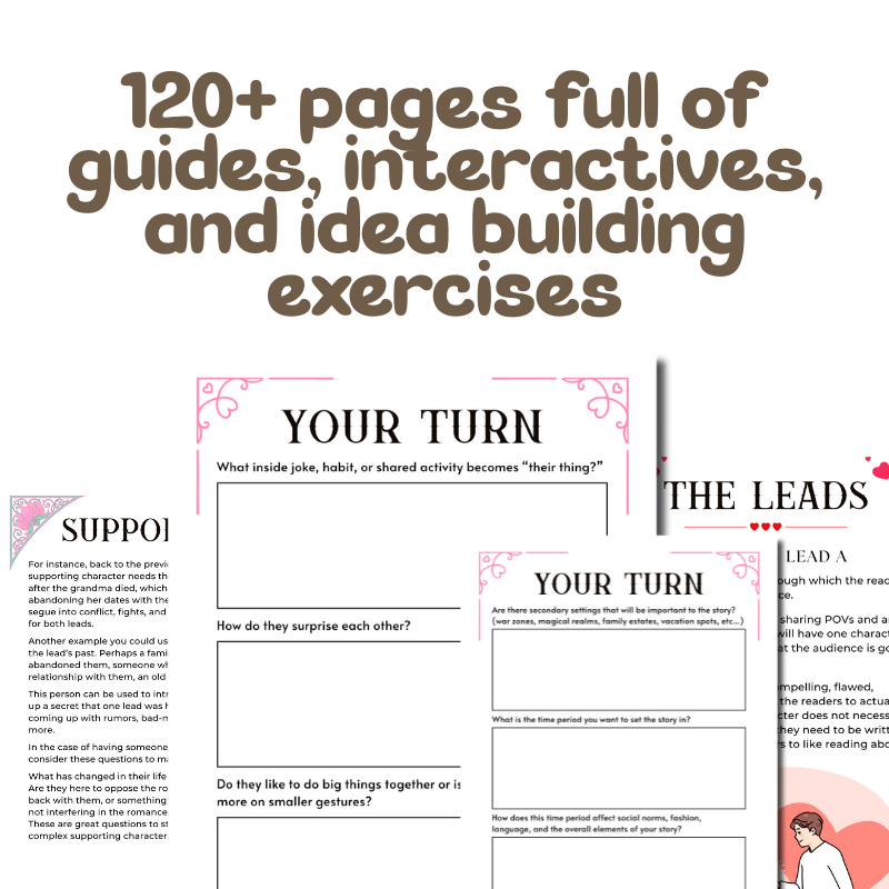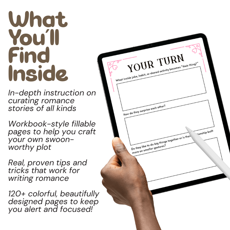 Through a combination of guided exercises, smart worksheets, and storytelling frameworks pulled from bestselling romance novels and fan-favorite media, this guide breaks down what makes a romance work and shows you exactly how to craft it.