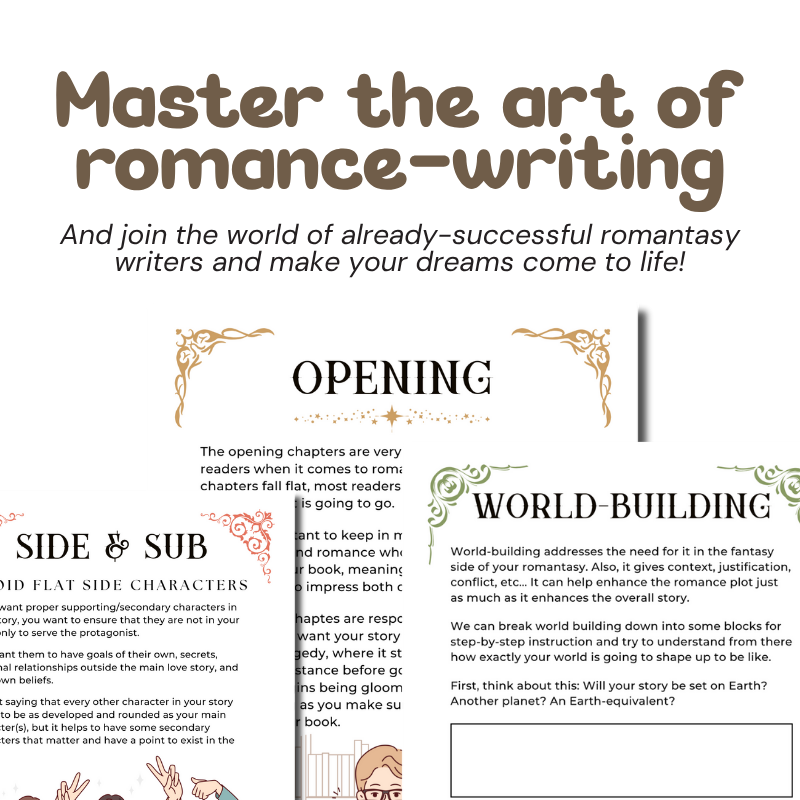 This guide is focused on romantasy (romantic fantasy or romance fantasy), but it can easily be used for fantasy (with) romance, paranormal romance, or any story that blends magic and love.