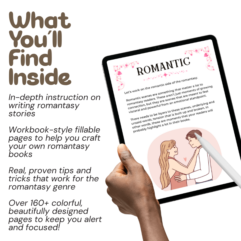 The Ultimate Romantasy Writing Guide lets you craft magical worlds, romantic tension, and high-stakes plots that readers love with over 160 pages of worksheets and step-by-step guidance to help you learn how to write a romantasy novel from start to finish.