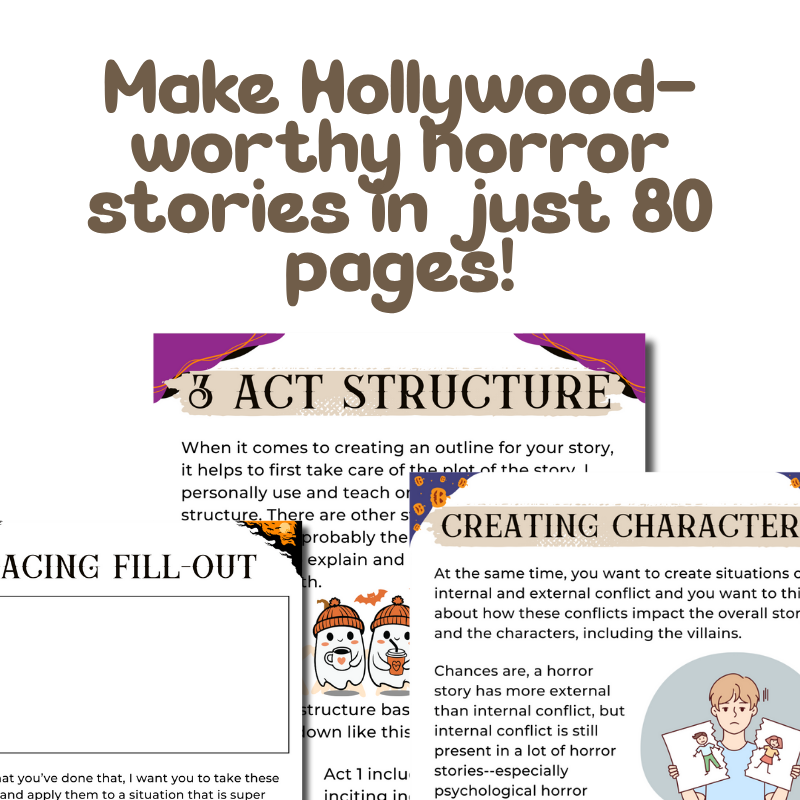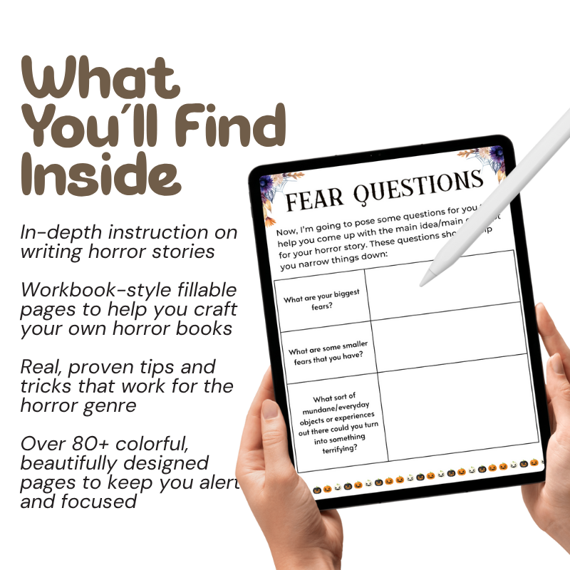 This 80+ page horror writing guide and interactive workbook walks you through every step of writing a terrifying story whether you’re crafting a haunted house novella, a chilling psychological short, or a full-length paranormal horror novel.